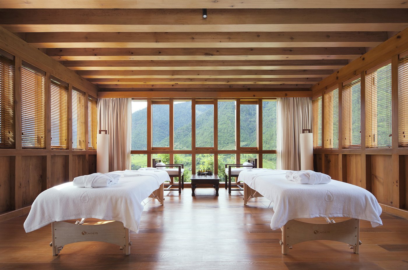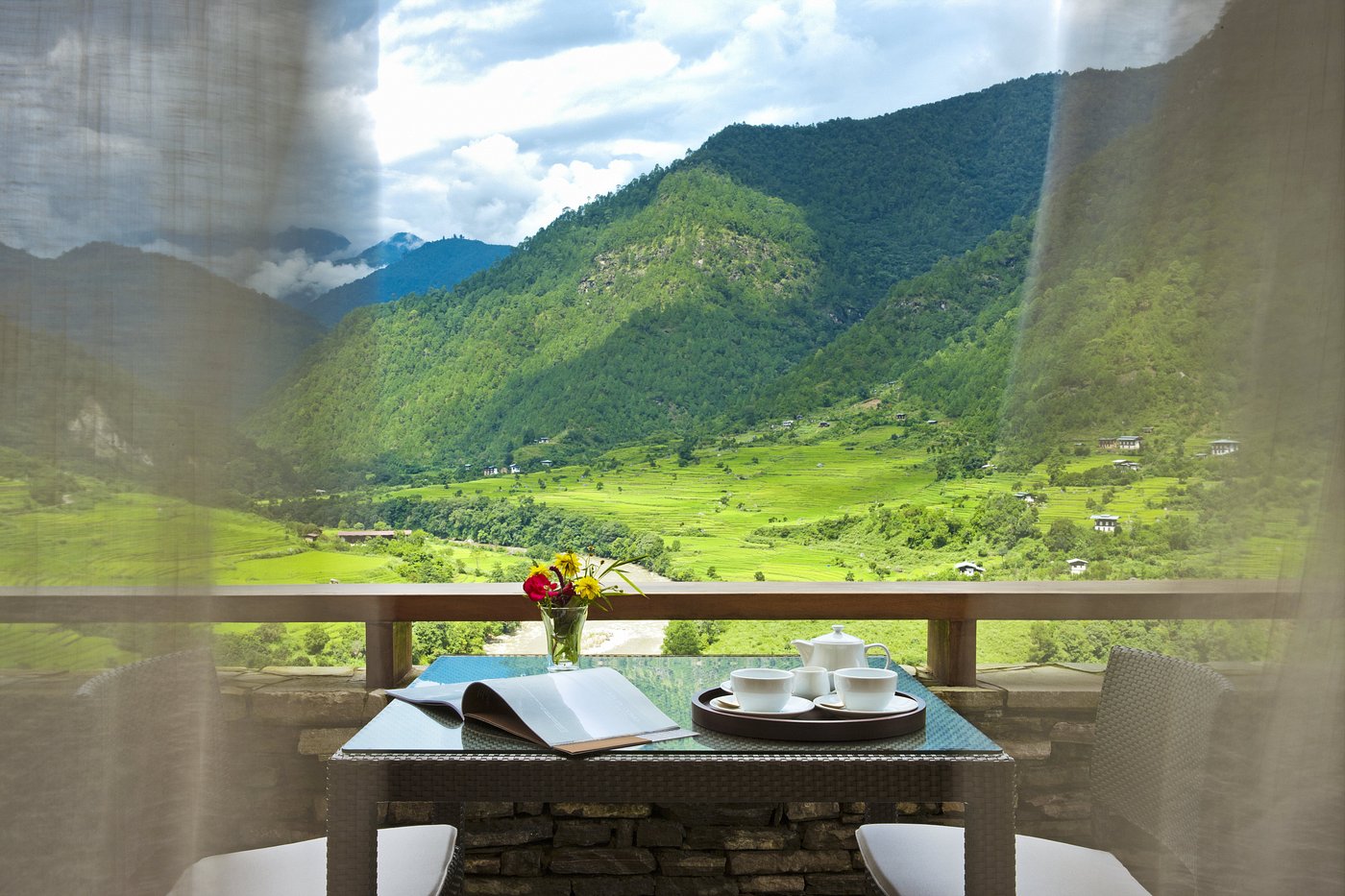 Set on a hillside overlooking the Mo Chhu River, Como Uma Punakha is an intimate lodge with 11 rooms and suites, including one two-bedroom villa. Accommodations feature wood floors, large windows, and private terraces with views of the valley and rice fields. The restaurant serves seasonal Bhutanese and international cuisine, complemented by ingredients from local farms. Facilities include a spa offering holistic treatments and yoga, as well as light-filled lounges and outdoor seating areas designed to connect guests with the surrounding landscape.
