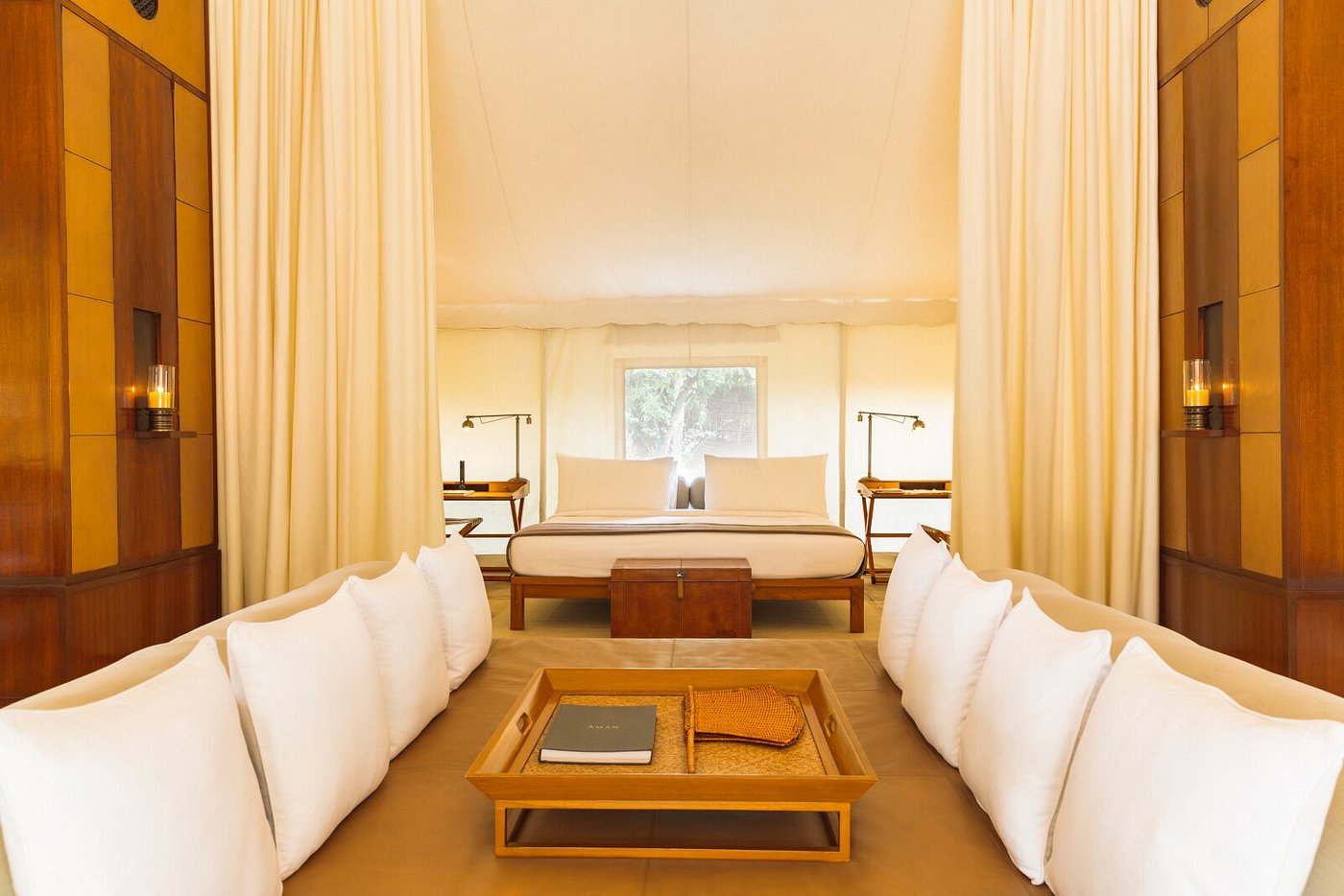 Situated on the threshold of the reserve, this intimate tented camp offers incomparable privacy and daily safaris seeking out the reserve’s wildlife. Aman-i-Khas offers spa therapies, swimming in a beautiful stone pool, and thoughtfully curated menus. The camp’s ten expansive and luxurious tents overlook a ruggedly beautiful landscape that is home to abundant wildlife. Positioned to ensure utmost privacy, the Tents offer soaring living spaces decorated with classic furnishings. The light-filled bathing area features a free-standing bathtub and shower, while the living room has twin writing desks.