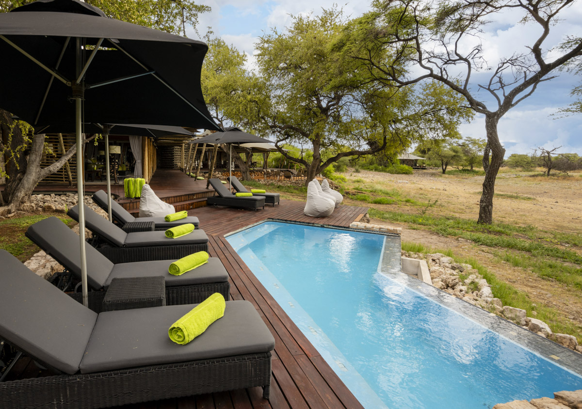 Onguma Tented Camp is a stylish, adults-only retreat set around a secluded waterhole on the private Onguma Reserve bordering Etosha National Park. The camp features seven spacious tented suites with stone floors, indoor and outdoor showers, and private decks facing the waterhole. Facilities include a lounge and dining pavilion with open views, a swimming pool surrounded by palms and acacias, and elevated walkways linking the tents. The camp’s design combines canvas, thatch, and natural textures to create a serene atmosphere focused on wildlife viewing right from the property.