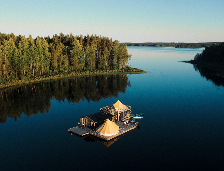 Aurora Safari Camp – The Floating Safari Camp is a unique off-grid retreat set on a lake in Swedish Lapland, accessible by boat or snowmobile depending on the season. The camp consists of floating tents built on wooden pontoons, each with cozy interiors, stoves, and panoramic windows for viewing the Northern Lights. Facilities include a floating lounge and dining platform, a sauna raft, and outdoor seating areas along the shore. Designed for minimal environmental impact, the camp combines wilderness isolation with understated Scandinavian comfort.