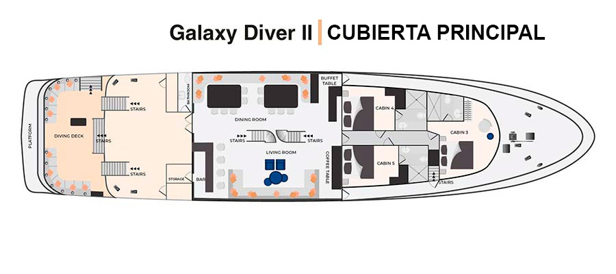 The Galaxy Diver II is a small expedition yacht operating in the Galápagos Islands, designed to accommodate both scuba divers and naturalist travelers on separate itineraries. The vessel offers eight air-conditioned cabins with private bathrooms, an indoor dining room, lounge, and an outdoor area, including a sun deck with seating. On dive departures, the boat is equipped with a dedicated dive deck, gear storage, compressors, and tenders for daily dive operations, while naturalist itineraries focus on shore landings and wildlife viewing led by certified guides. The Galaxy Diver II emphasizes functional comfort and flexibility, allowing guests to choose between an active diving-focused voyage or a classic Galápagos exploration without diving facilities dominating the onboard experience. Note that for diving itineraries, you have to be a certified advanced diver with at least 50 recorded dives, including deep, current, and night dives. Prepare to have your logbook documenting your dives with you.