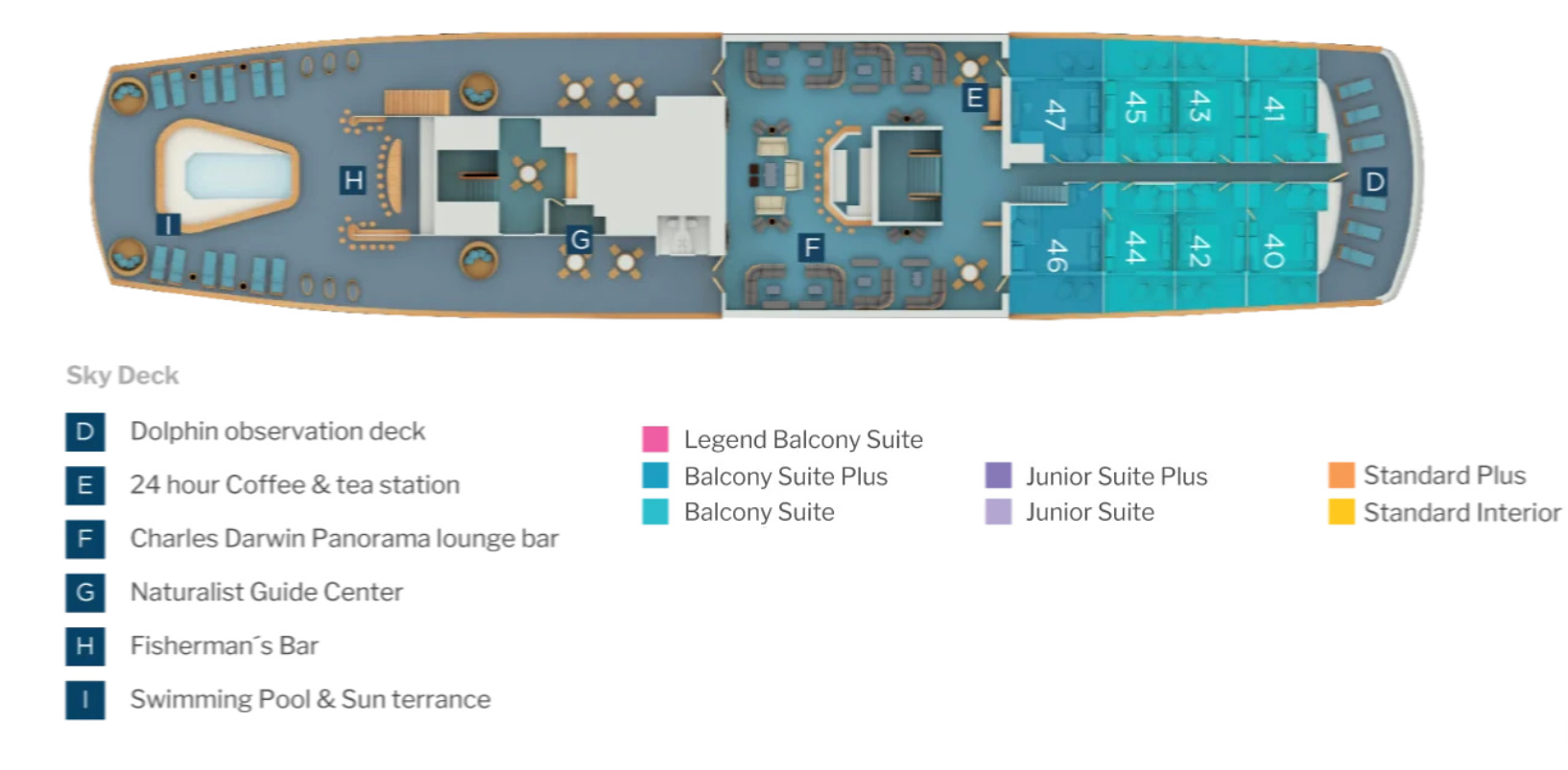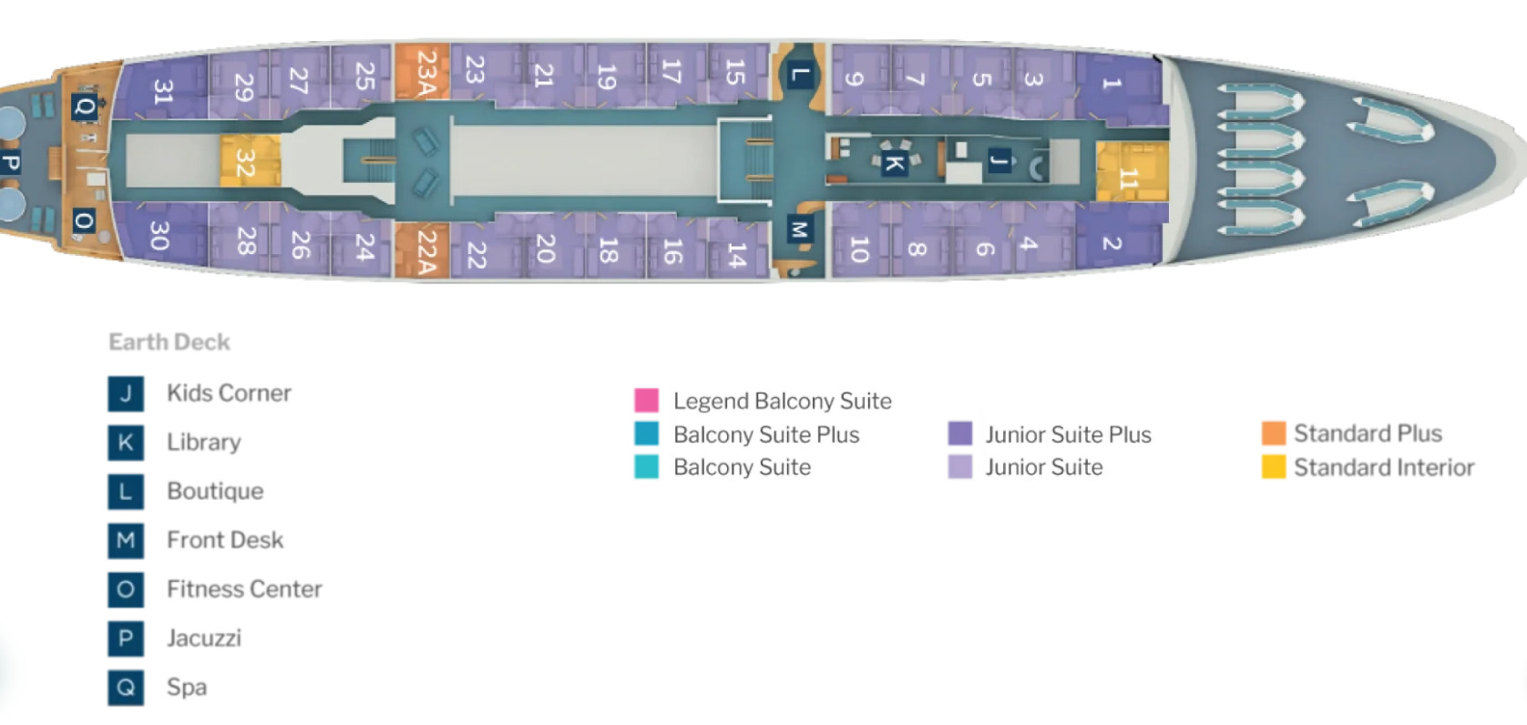 • Legend Suite – 215 sq. ft. – Located on the Earth Deck – Double, triple, and quadruple bed options