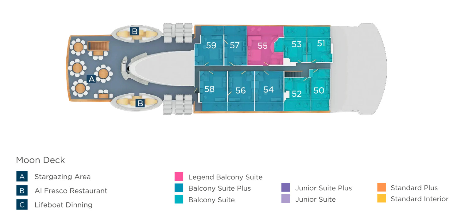 • Legend Balcony Suite – 355 sq. ft. – Located on the Moon Deck – Double and triple bed options