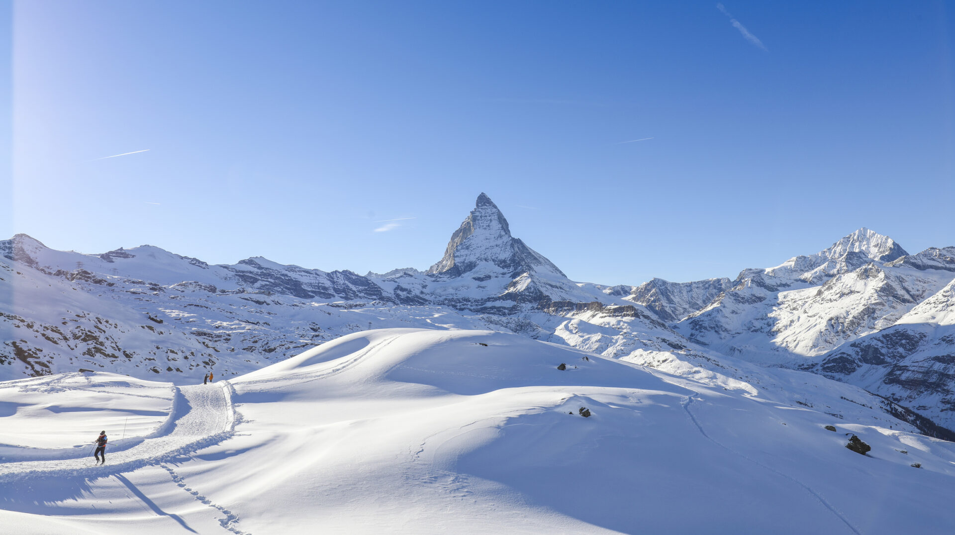 The ski areas of Zermatt offer an impressive variety of slopes and reach up to 3,883 meters, making it one of the highest ski areas in the Alps. A special highlight is the possibility to ski from Zermatt over the Klein Matterhorn to Italy to the Cervinia/Valtournenche ski area, which enables cross-border skiing fun. With a total of over 360 kilometers of slopes, there are routes for every ability, from gentle descents to challenging glacier slopes. In addition, the breathtaking views of the Matterhorn and the numerous cozy mountain huts and restaurants offer an unforgettable experience.