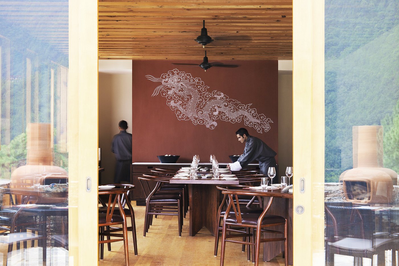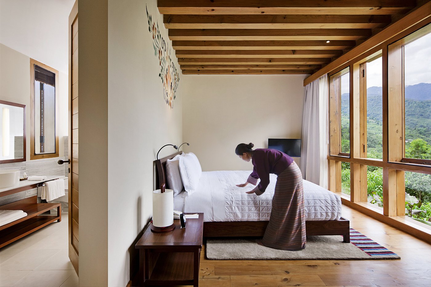 Set on a hillside overlooking the Mo Chhu River, Como Uma Punakha is an intimate lodge with 11 rooms and suites, including one two-bedroom villa. Accommodations feature wood floors, large windows, and private terraces with views of the valley and rice fields. The restaurant serves seasonal Bhutanese and international cuisine, complemented by ingredients from local farms. Facilities include a spa offering holistic treatments and yoga, as well as light-filled lounges and outdoor seating areas designed to connect guests with the surrounding landscape.