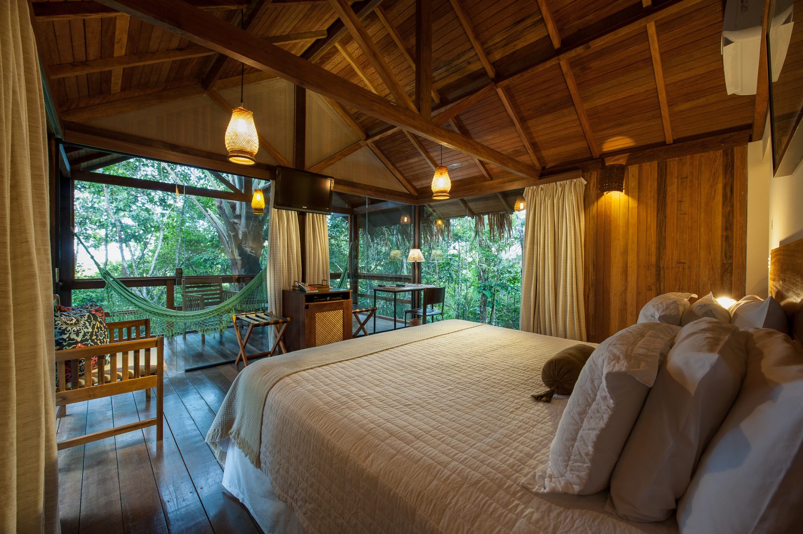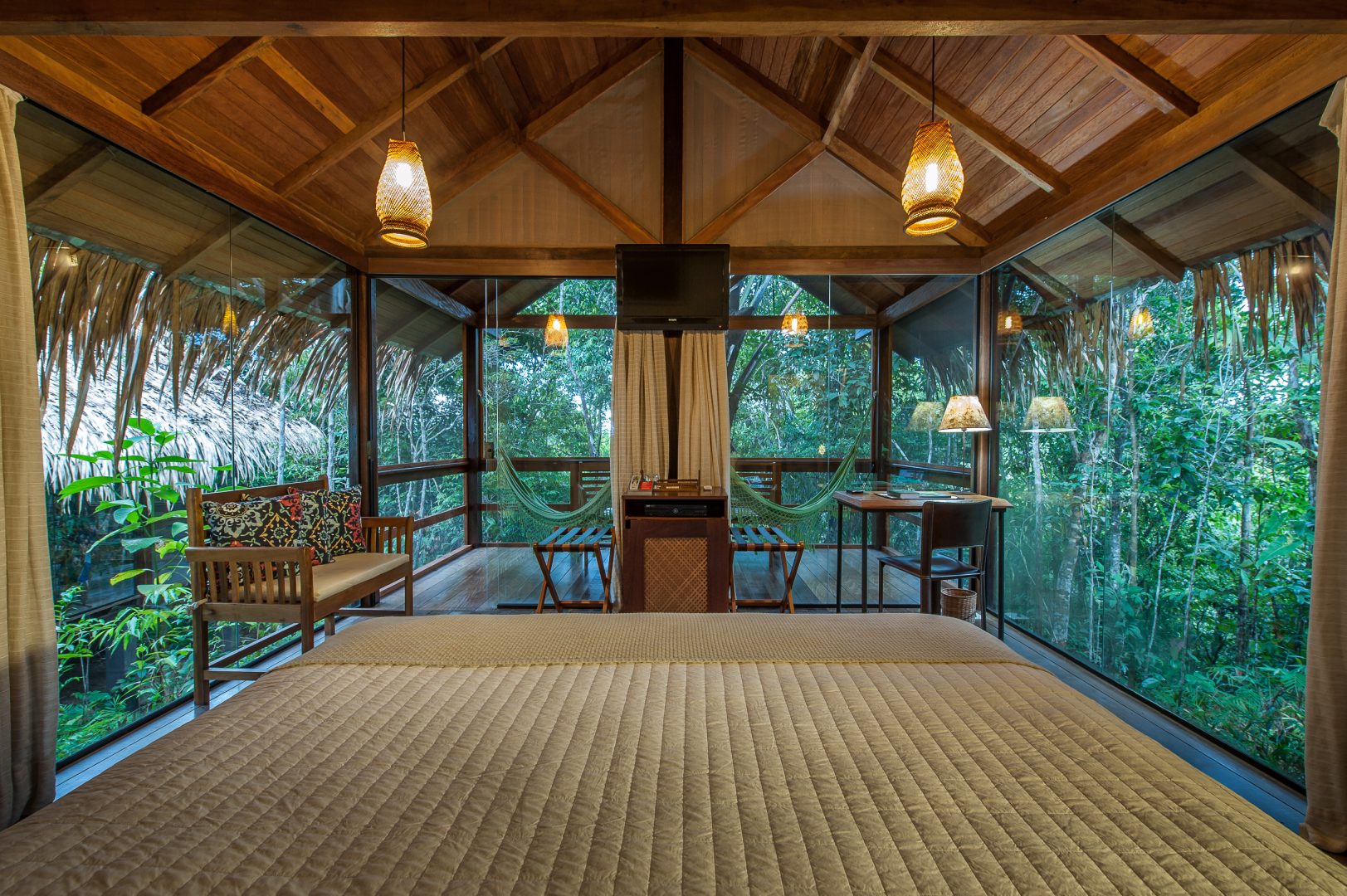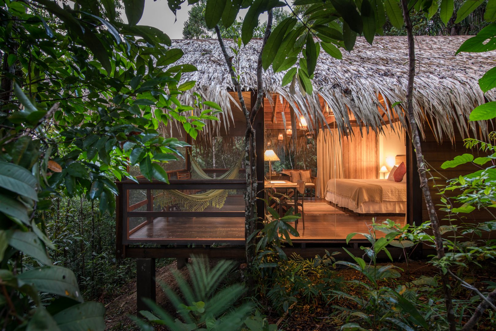 Anavilhanas Jungle Lodge sits across from Anavilhanas National Park, on the shore of the Rio Negro. Each of its 16 thatched, wooden bungalows are perched upon stilts. They have their own balconies and hammocks, with views of the jungle. Guests dine in a separate thatched lodge, where they savor local produce, including tropical fruits and fresh fish. The lodge also offers a pool and games room.