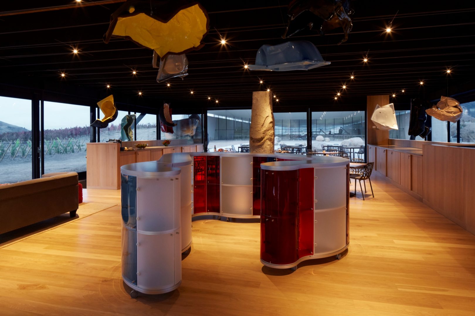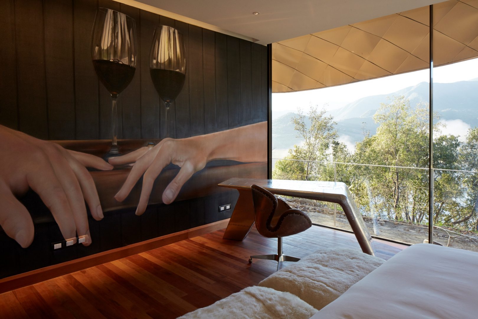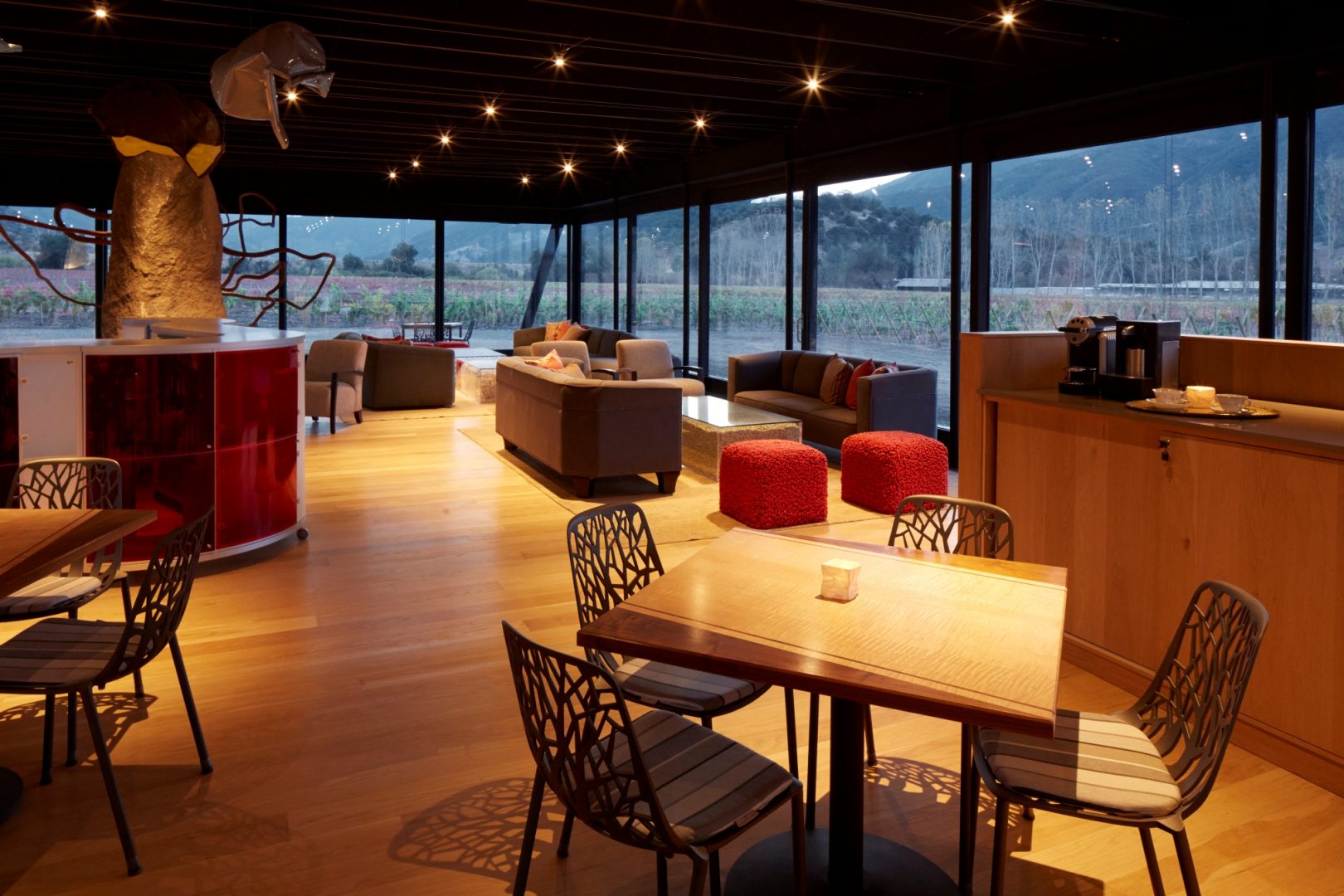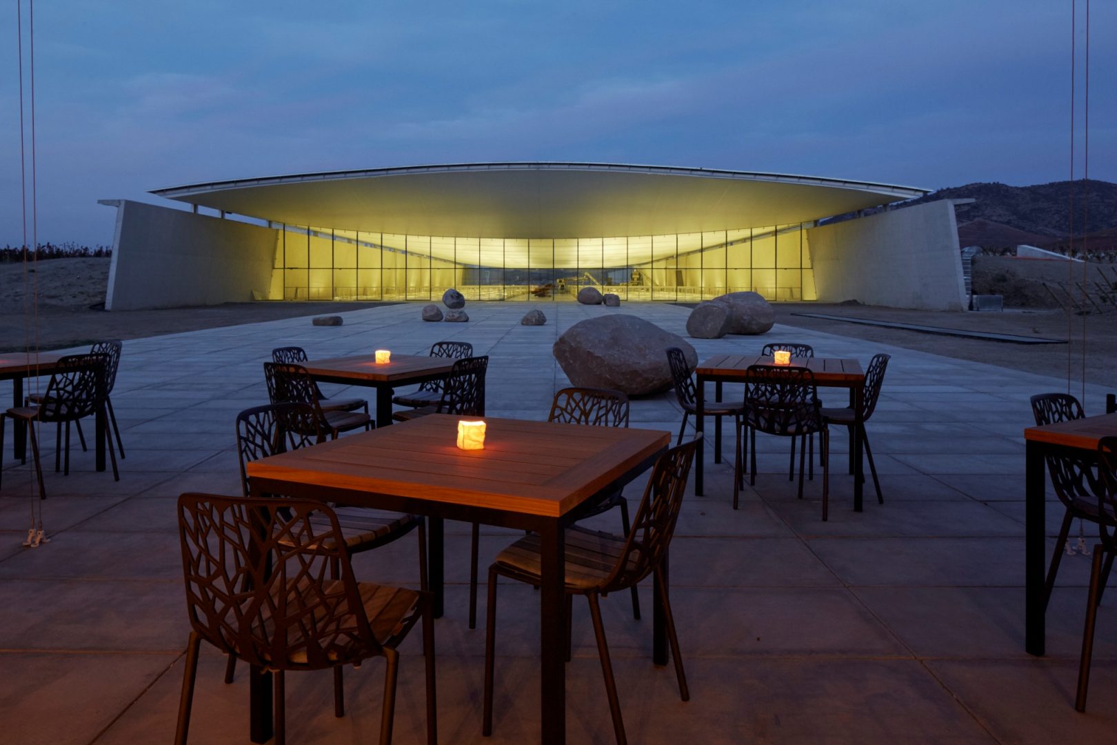 Viña Vik is a 22-suite hotel and spa located in the VIK vineyard of Millahue, Chile. The hotel is situated on a hill with panoramic views of the 11,000-acre vineyard, with the majestic Andes Mountains in the distance. Every suite has floor-to-ceiling windows, and a cantilevered granite infinity pool offers views of the valleys and lake below. On-site activities include private wine tastings and guided winery tours, horseback and mountain biking excursions through the vineyard and surrounding mountains, or treatments in the wine spa. The restaurant offers cuisine focusing on typical Chilean dishes, made with fresh local produce and specially prepared to complement the wine list. They can also arrange barbecues in the surrounding forest, with panoramic views out over the breathtaking landscape.