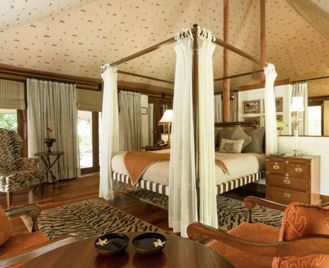 The Oberoi Vanyavilas Wildlife Resort, a 5 star hotel in Ranthambhore, offers luxury tented accommodation inspired by the opulent caravans of the royal families, a fine restaurant serving authentic Rajasthani and international cuisine, a spacious lap pool, and spa experiences customized to suit your needs. The entire experience is elevated by world-class hospitality. The highlight of a stay here is its proximity to Ranthambhore Tiger Reserve, where the population of Bengal Tigers is estimated to be around eighty. The number of sightings has doubled in the last three years, and most guests from The Oberoi Vanyavilas have reported seeing tigers.