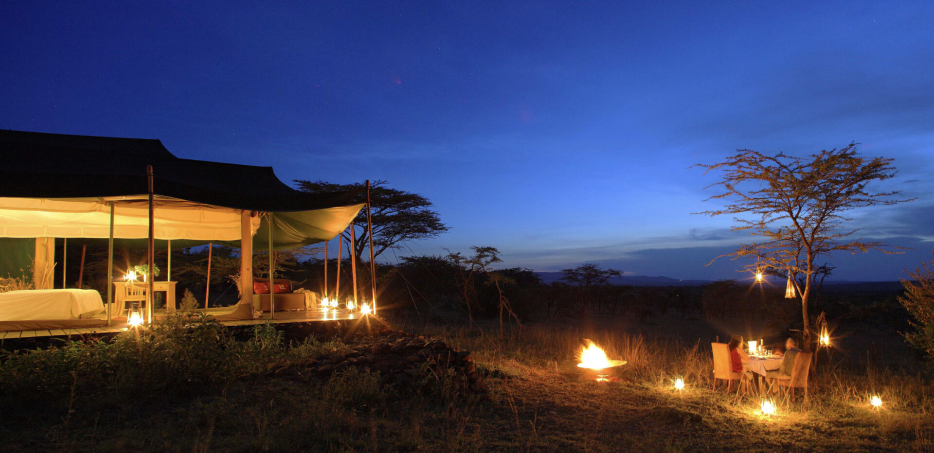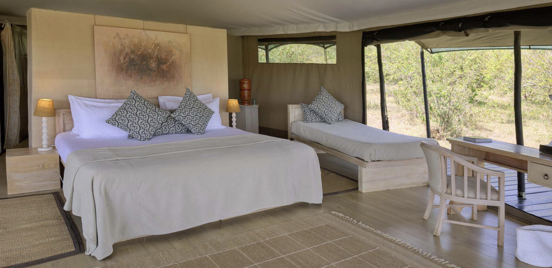 Kicheche Valley, located in acacia woodlands in a secluded valley of the Naboisho Conservancy, is an intimate boutique tented camp. The six luxurious tents are built in a unique style incorporating eco-friendly standards, and are set on platforms to provide the perfect base for looking over stunning wildlife and wilderness. Kicheche Valley prides itself on its high standards of exceptional guides and supporting the local surrounding communities. Guests can enjoy food prepared with local organic ingredients, bird watching and nature hikes, a small spa, yoga classes, and an open-air lounge space.