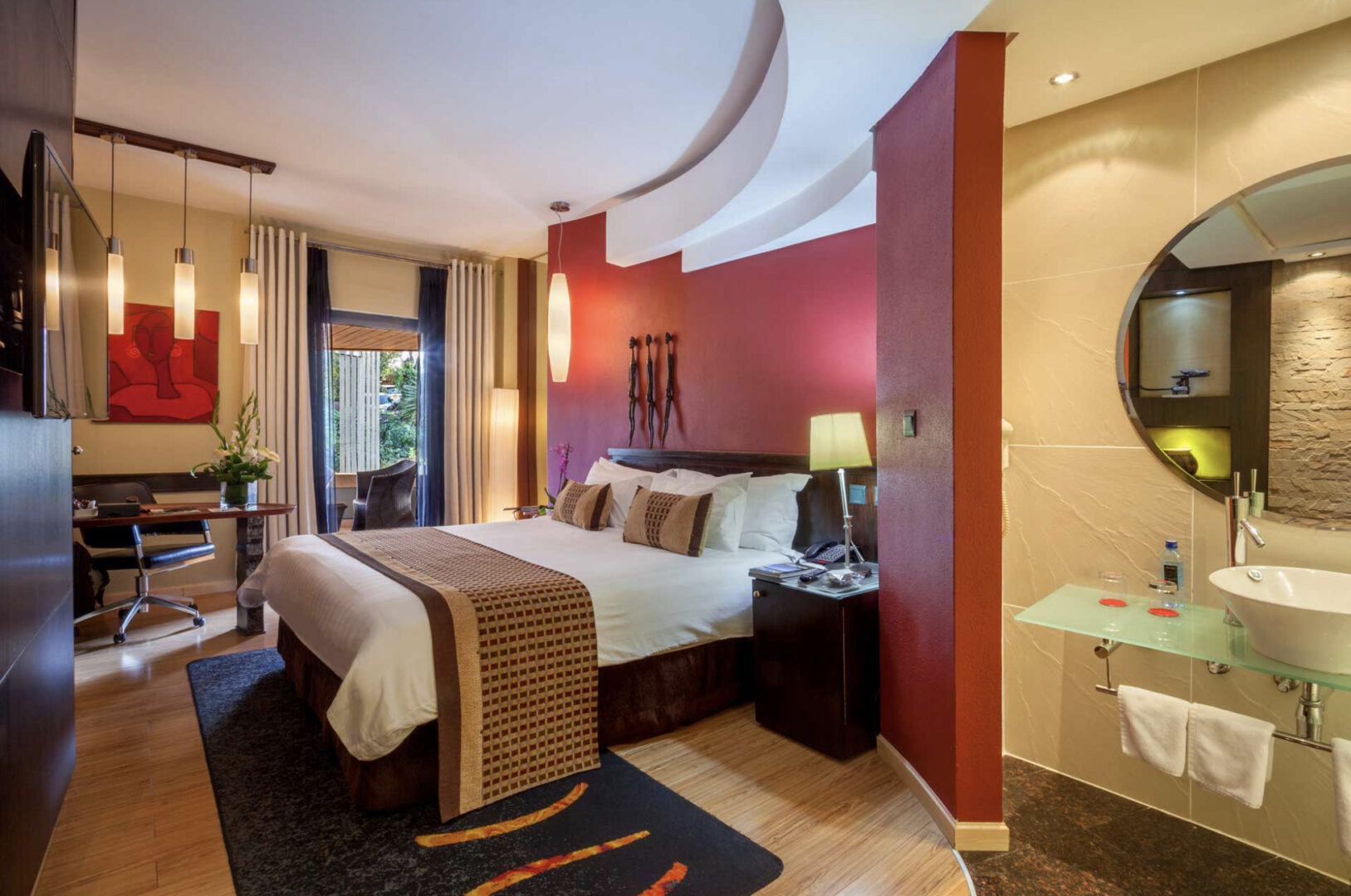 Tribe Hotel Nairobi is a bright and modern hotel located in the heart of the city. The 128 rooms and suites are decorated with rich deep colors, accented with natural stone and wood, handmade furniture, world-class amenities, and new age technology. The on-site restaurant is a tribute to local farmers; paying homage to crisp flavors and fresh, organic ingredients. Guests can enjoy the spa and fitness center, and spacious lounge areas.