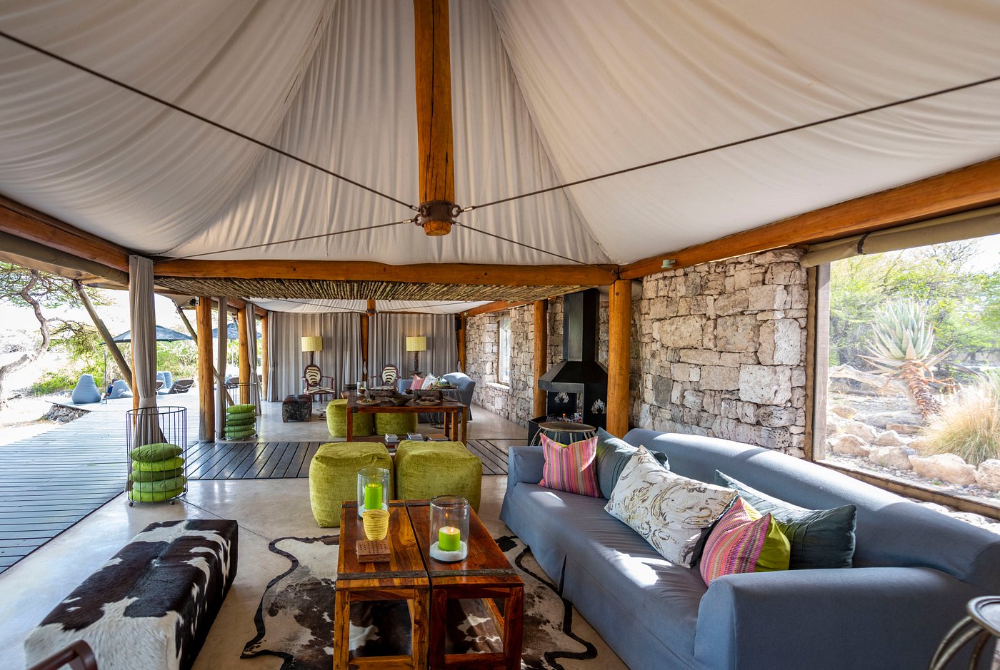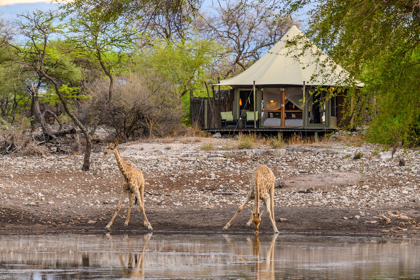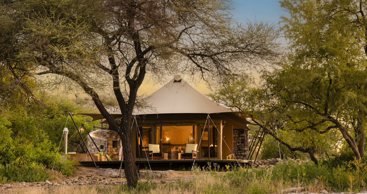 Onguma Tented Camp is a stylish, adults-only retreat set around a secluded waterhole on the private Onguma Reserve bordering Etosha National Park. The camp features seven spacious tented suites with stone floors, indoor and outdoor showers, and private decks facing the waterhole. Facilities include a lounge and dining pavilion with open views, a swimming pool surrounded by palms and acacias, and elevated walkways linking the tents. The camp’s design combines canvas, thatch, and natural textures to create a serene atmosphere focused on wildlife viewing right from the property.