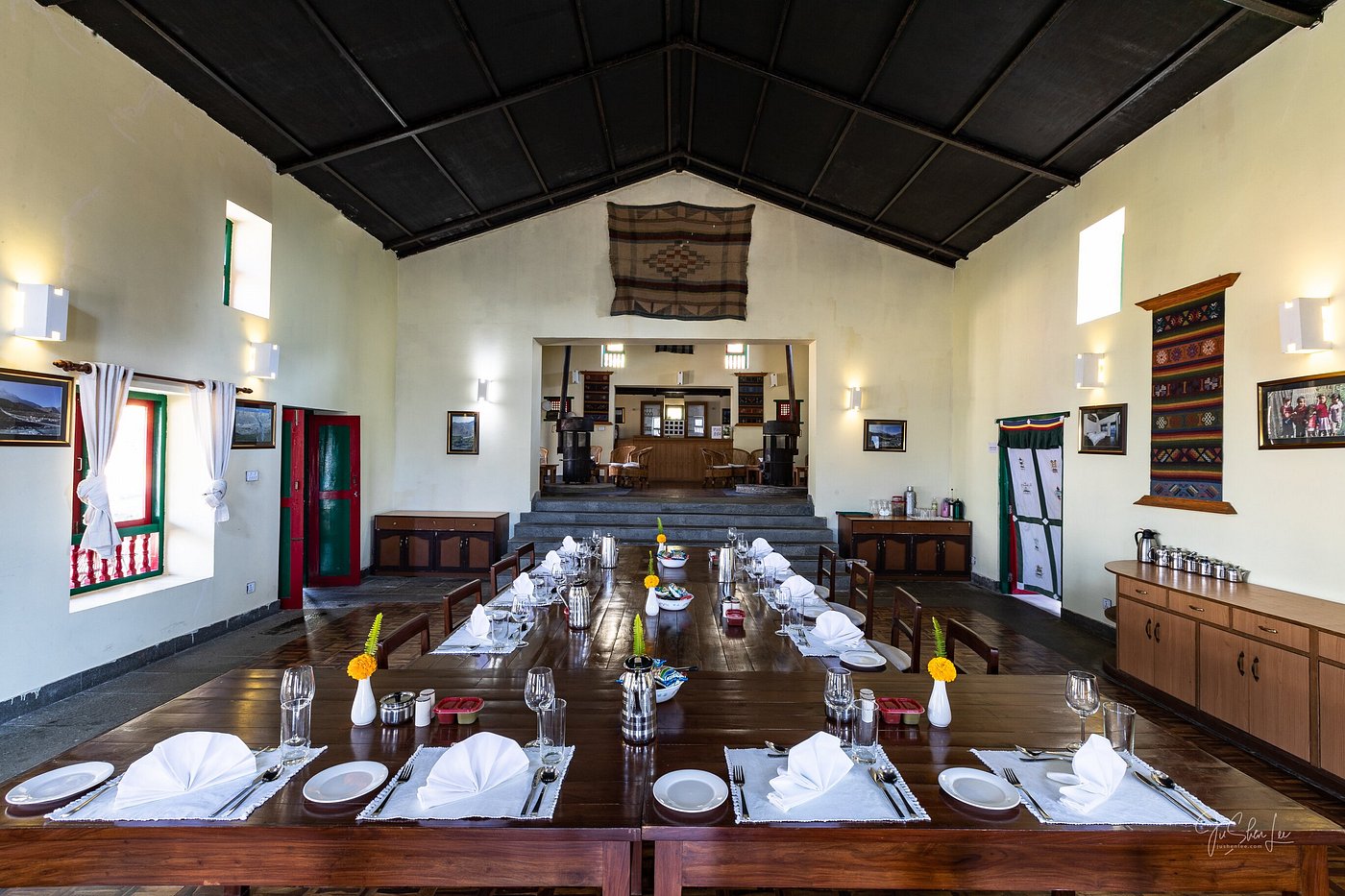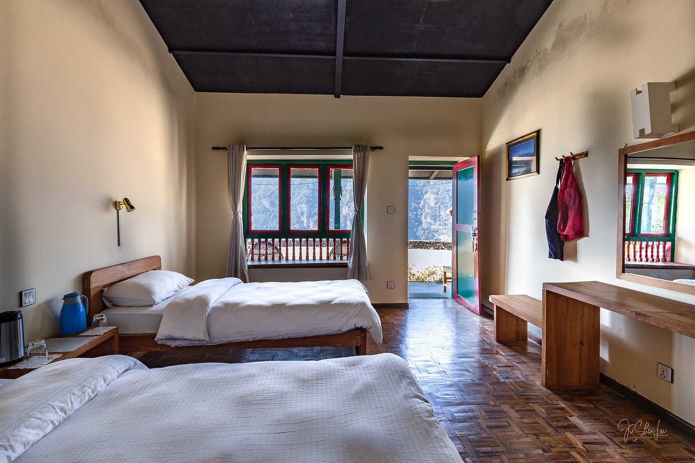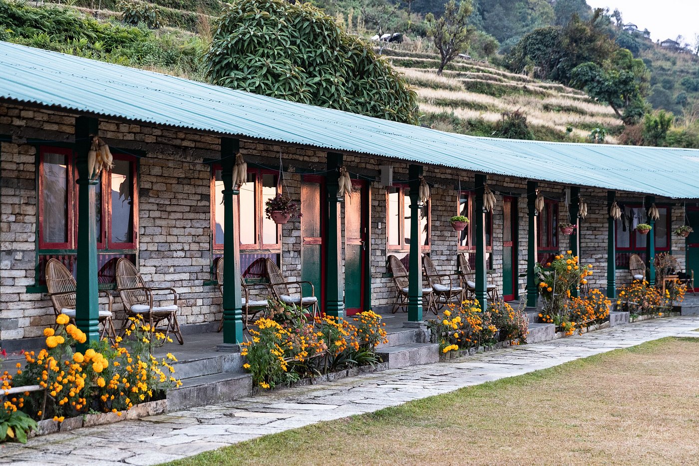 Half way up the mountainside, the freshly built Landruk Lodge is a crescent of green and white terraced bungalows in classic Nepalese style. Twelve contemporary and comfortable rooms are furnished with twin beds, modern, black-slate en suite bathrooms, and terraces with jaw-dropping Annapurna views. Design features include parquet wood floors, bedside up-lights, and vaulted, rafted ceilings. Guests can enjoy fireside drinks in a cozy dining room with picture windows, delicious chef-made meals, morning tea room service, and breakfast at a sunny outdoor table amid neat gardens.