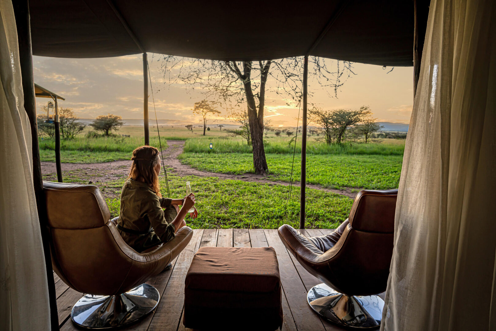 Each of the en-suite tents has 2 Queen beds and features an outside deck with loungers overlooking the surrounding nature. The dining tent includes a separate bar, and there are sitting and dining areas in the main tent with cozy leather sofas. Guests can enjoy a scenic sundowner outside, then end the night relaxing around the campfire.