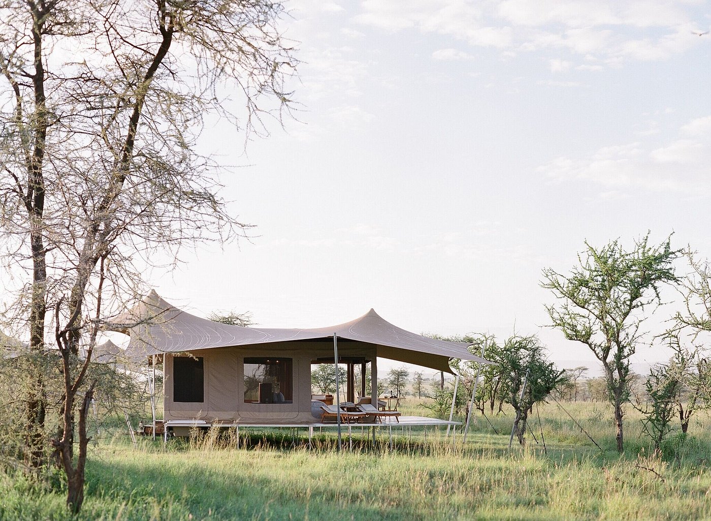 Roving Bushtops has 15 luxury tented suites overlooking the Serengeti. The tents, or “rovers,” are open on two sides to offer a panoramic view, and feature large wooden decks with sun loungers, dining table, and a sunken bathtub. The camp offers an open-sided restaurant and bar, as well as poolside and in-room dining, a swimming pool, and spa. Excursions are guided by expert trackers from the local Kuria tribe.