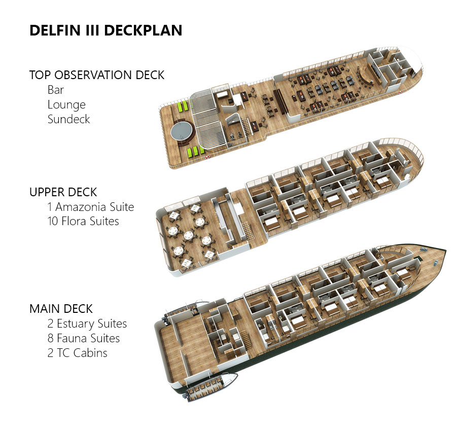 The Delfin III offers upscale Amazon River cruises as part of the Delfin Amazon Cruises fleet (all Relais & Chateaux). This is the newest ship in the Delfin fleet and is also the largest, with the capacity for 44 passengers. The beautifully designed ship includes hardwood floors, designer furniture, and Peruvian artifacts. Guests can choose from four room classes; there are a total of 22 rooms. The top deck features an indoor/outdoor lounge, a sundeck with plunge pool, a spa, a gym, and a bar.