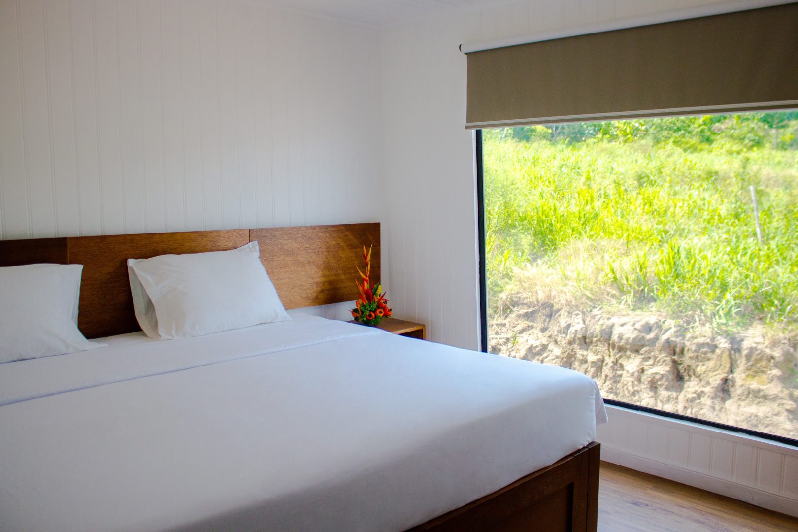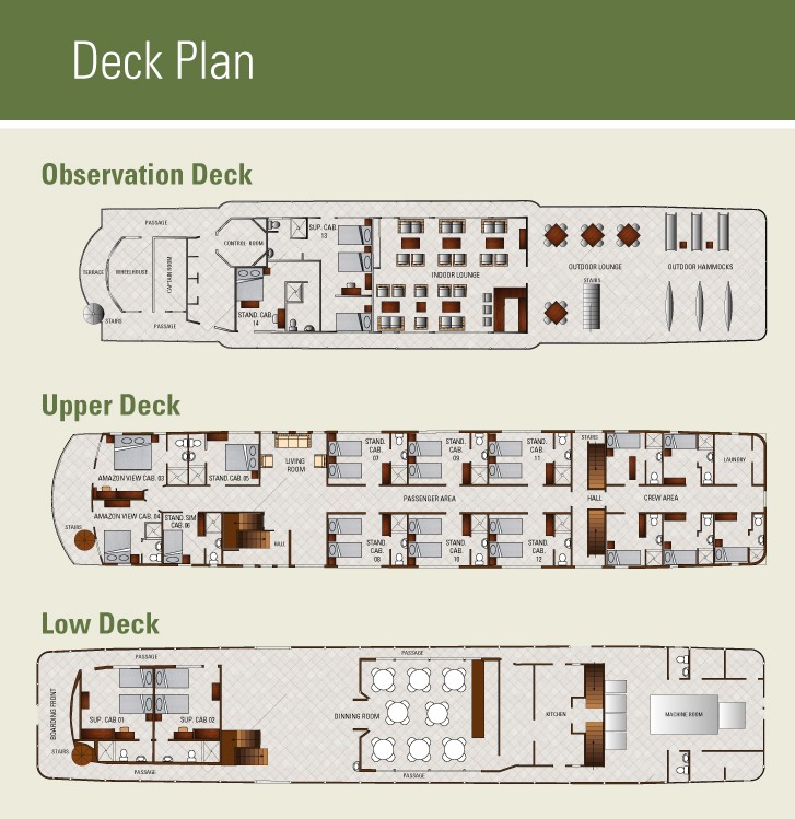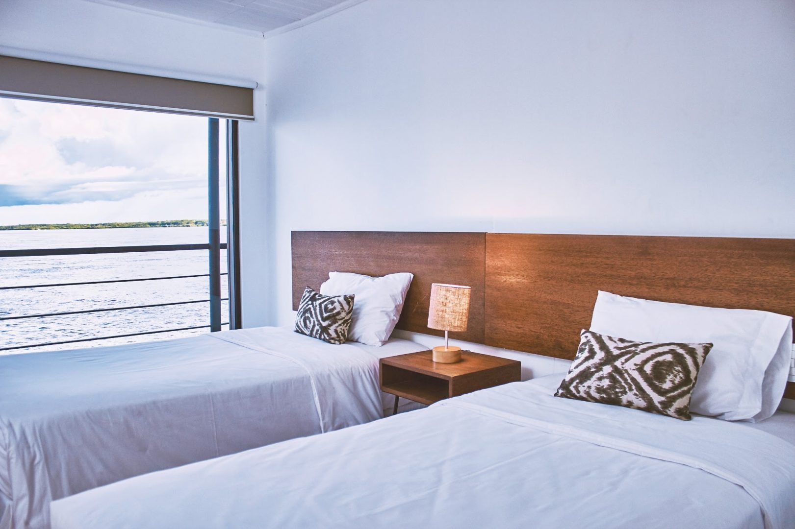 Amazon View cabins: 173 square feet (16 square meters) – one queen bed or king bed and private bathroom with shower. Access the balcony.