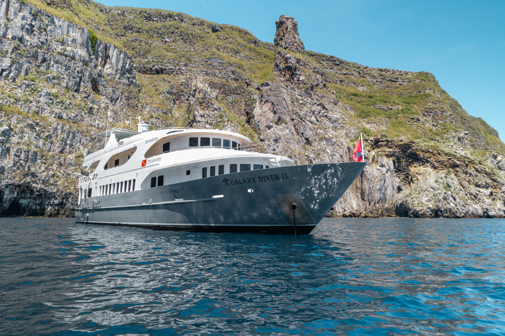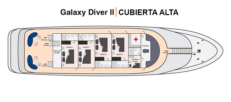 The Galaxy Diver II is a small expedition yacht operating in the Galápagos Islands, designed to accommodate both scuba divers and naturalist travelers on separate itineraries. The vessel offers eight air-conditioned cabins with private bathrooms, an indoor dining room, lounge, and an outdoor area, including a sun deck with seating. On dive departures, the boat is equipped with a dedicated dive deck, gear storage, compressors, and tenders for daily dive operations, while naturalist itineraries focus on shore landings and wildlife viewing led by certified guides. The Galaxy Diver II emphasizes functional comfort and flexibility, allowing guests to choose between an active diving-focused voyage or a classic Galápagos exploration without diving facilities dominating the onboard experience. Note that for diving itineraries, you have to be a certified advanced diver with at least 50 recorded dives, including deep, current, and night dives. Prepare to have your logbook documenting your dives with you.