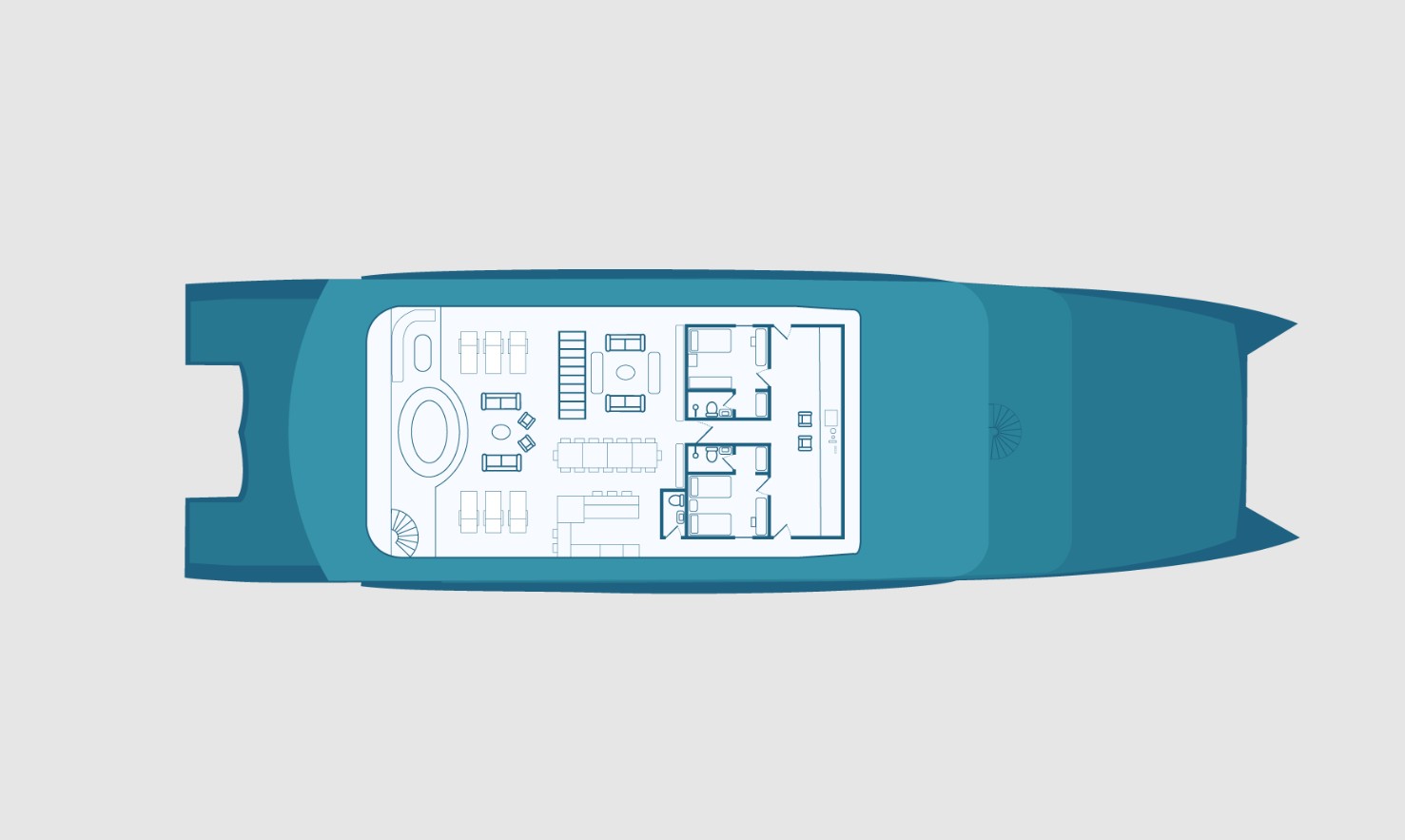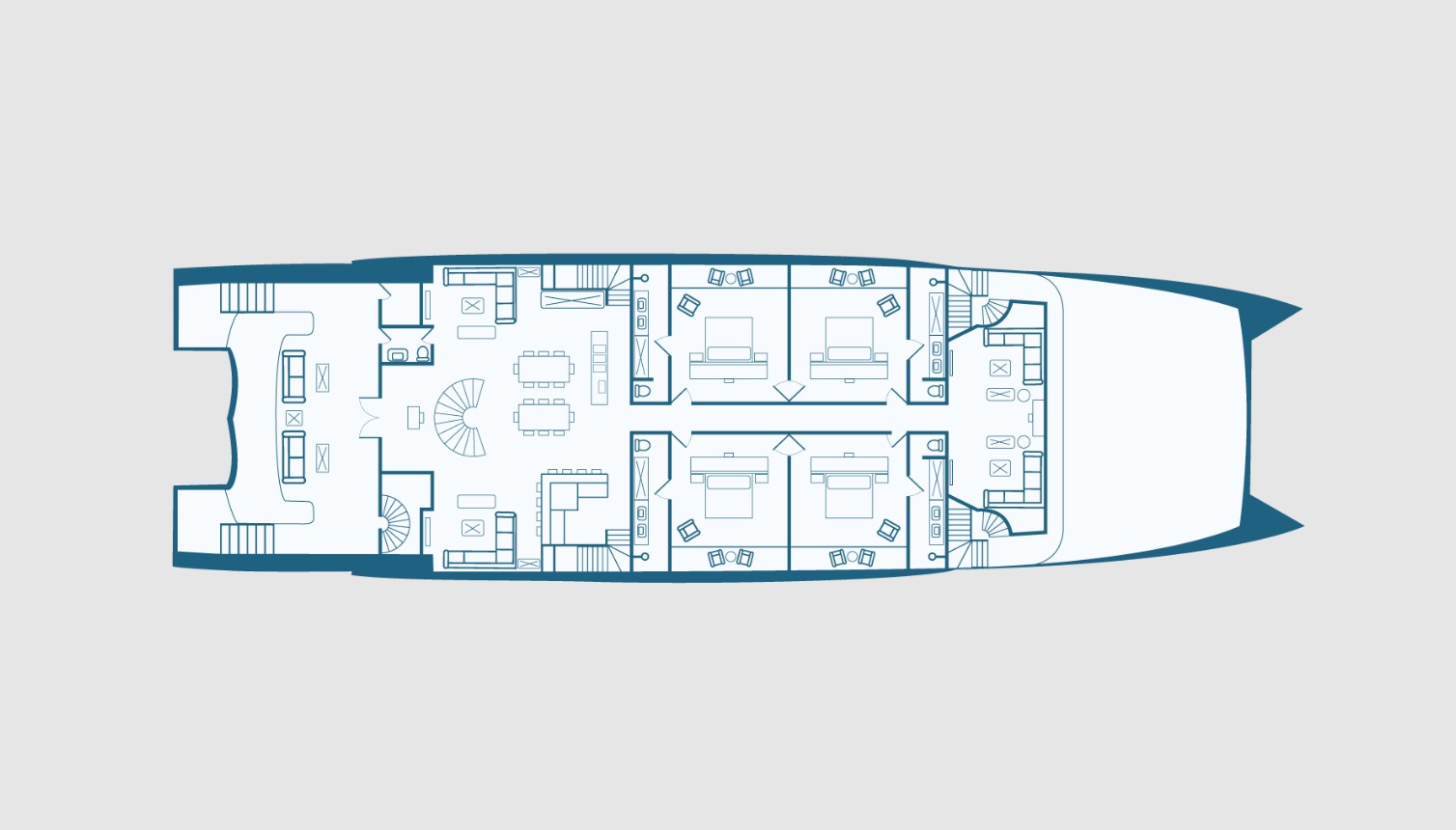 Setting sail in October 2026, the Grand Ocean Spray is a luxury carbon-neutral Galapagos catamaran accommodating 16 passengers in eight suites, all with private balconies. The vessel spans three decks and features a spacious dining room, upscale lounge areas, a fully stocked bar, outdoor social spaces including a sun deck with alfresco dining, and an onboard spa. Sea kayaks and stand-up paddleboards are available for guest use.