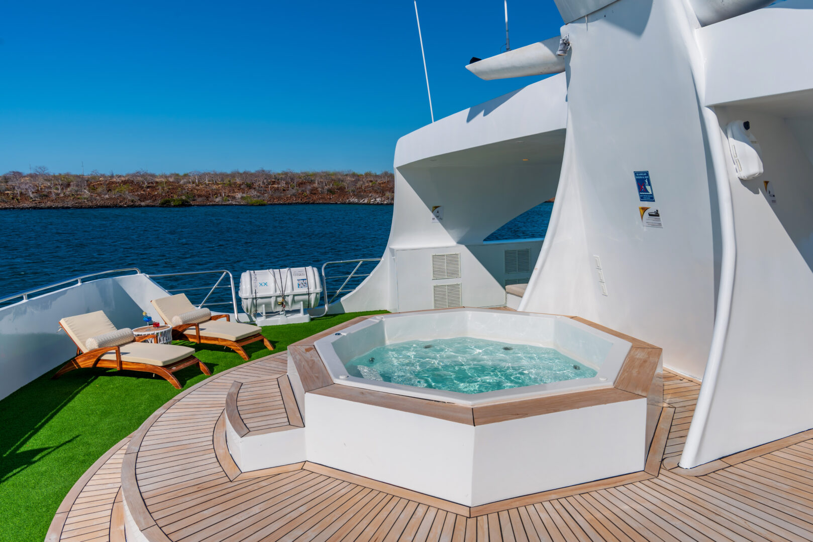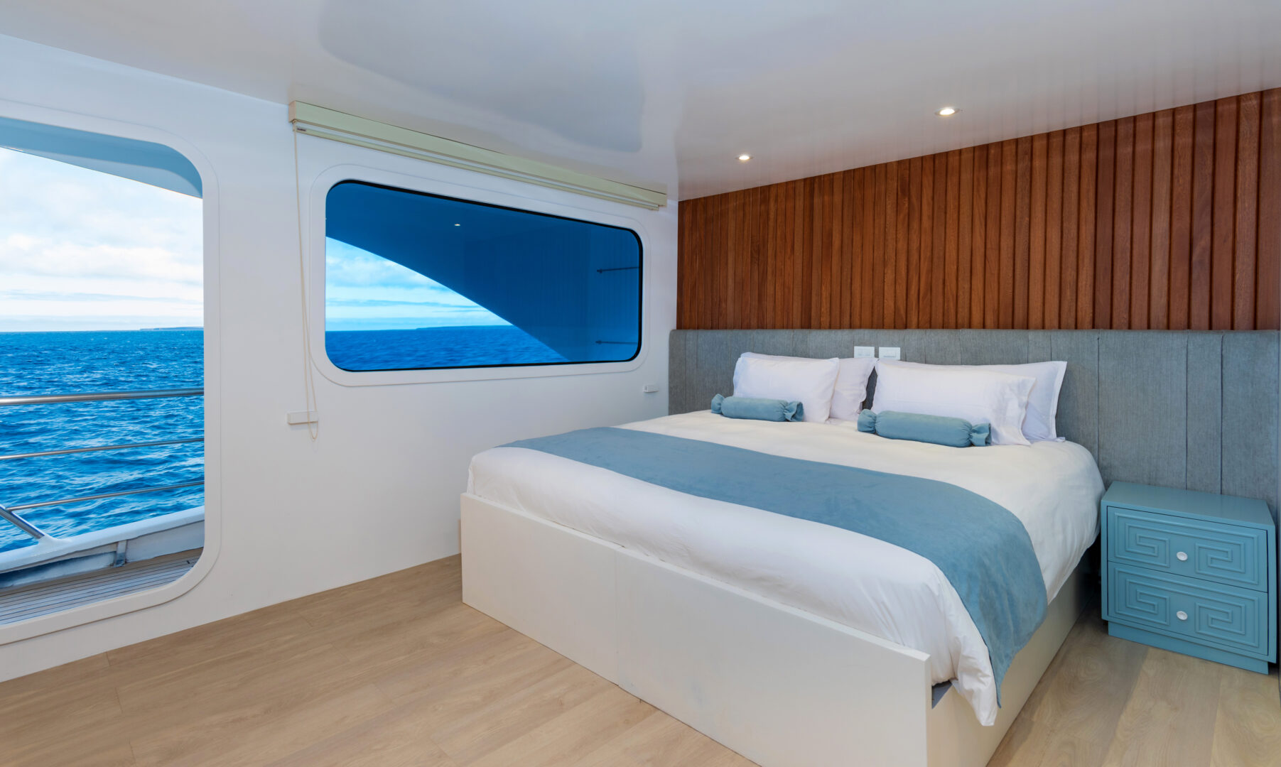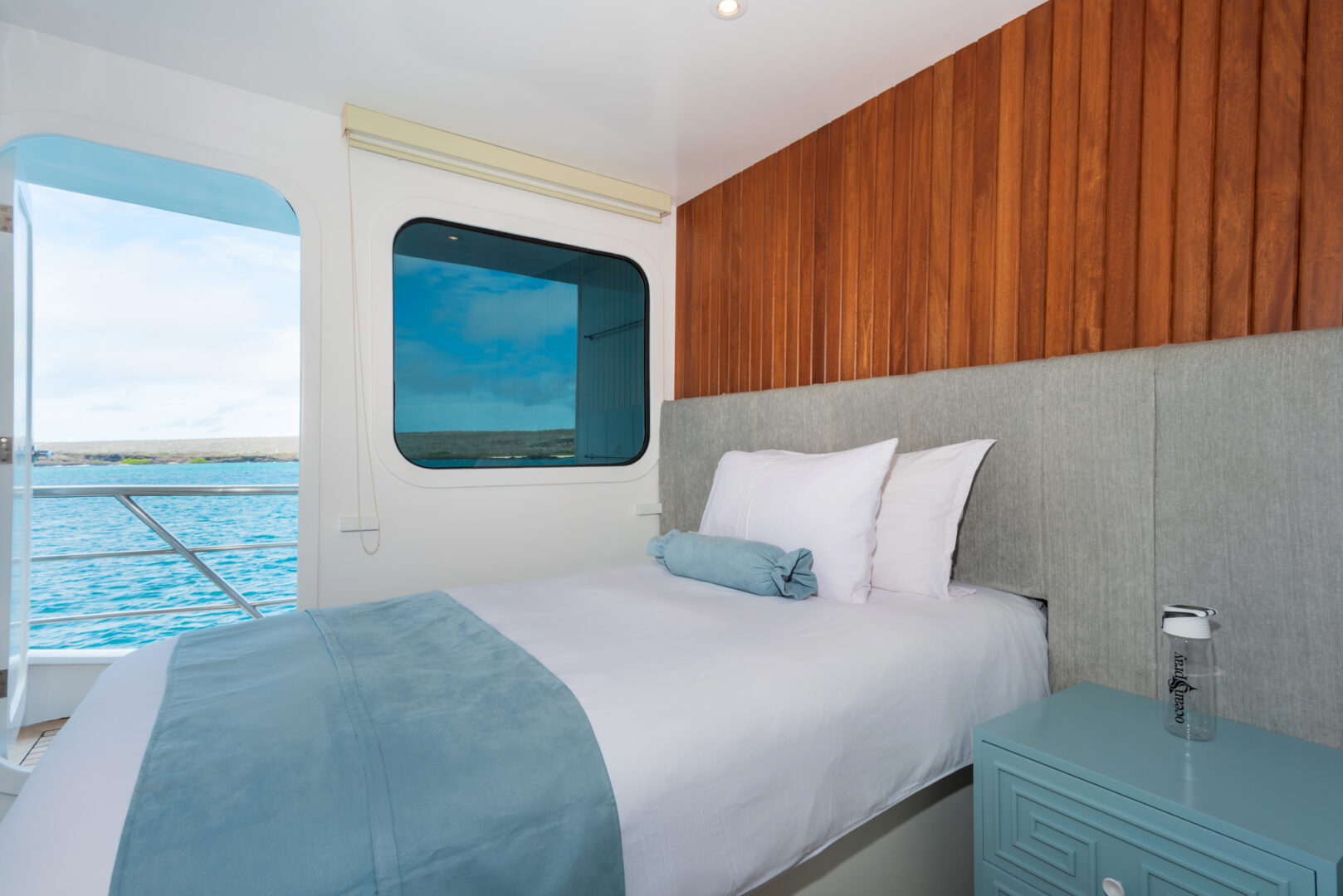 The Ocean Spray is a standout among Galapagos catamarans. Each cabin features a private balcony, allowing you to take in the islands’ dramatic landscapes from the privacy of your room. With a large sundeck, inviting social areas, and smooth performance at sea, the Ocean Spray feels both refined and relaxed. Guided daily excursions—led by expert bilingual naturalist guides—include snorkeling with sea turtles, hiking across volcanic terrain, kayaking quiet coves, and paddleboarding calm coastal waters. Consistently praised by past travelers, this is one of the most sought-after ships for exploring the Galapagos Islands.