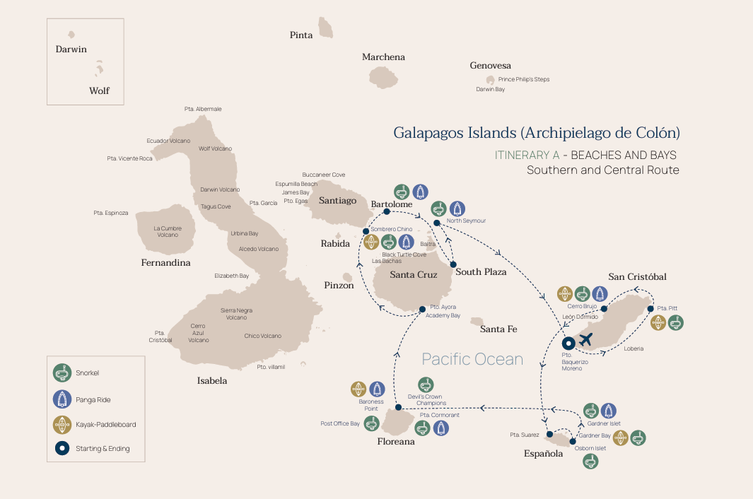Three of the newer boats in the islands, the Origin, Theory, and Evolve are sister ships designed for a luxurious boutique experience. These 20-passenger Relais & Chateaux ships have 10 cabins with panoramic windows and feature spacious social areas, sun decks and jacuzzis, space for al fresco dining, a fitness center, spa, and a glass-bottom boat. Meals are planned and prepared by trained chefs, there is an onboard concierge for assistance, and the boats have an open bar policy. With two naturalist guides, Origin/Theory/Evolve offer some of the best guide-to-guest ratios in the islands. Excursions include snorkeling, hiking, kayaking, stand-up paddle boarding, and panga rides.