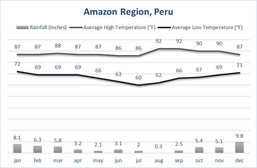 In the Amazon jungle of Northern Peru (near Iquitos), temperatures are generally high during the day (in the high 80s) and there is almost always very high humidity and at least some rain (this is a rainforest after all!). There is a high water season from December to May when the average temperate is in the 80s which is slightly cooler than in the dry season. During this time, the water levels increase quite significantly. From June to November is the low water season when temperatures are warmer and average in the 90s during the day. The low water season sees a significant drop in water levels.