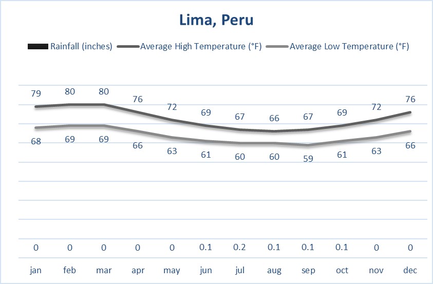 In Lima, the rainy season is from June to September, though in reality it doesn’t often rain. During this same period Lima is often covered in a blanket of mist that is called the “garúa.” For the rest of the year Lima is generally sunny and hot.