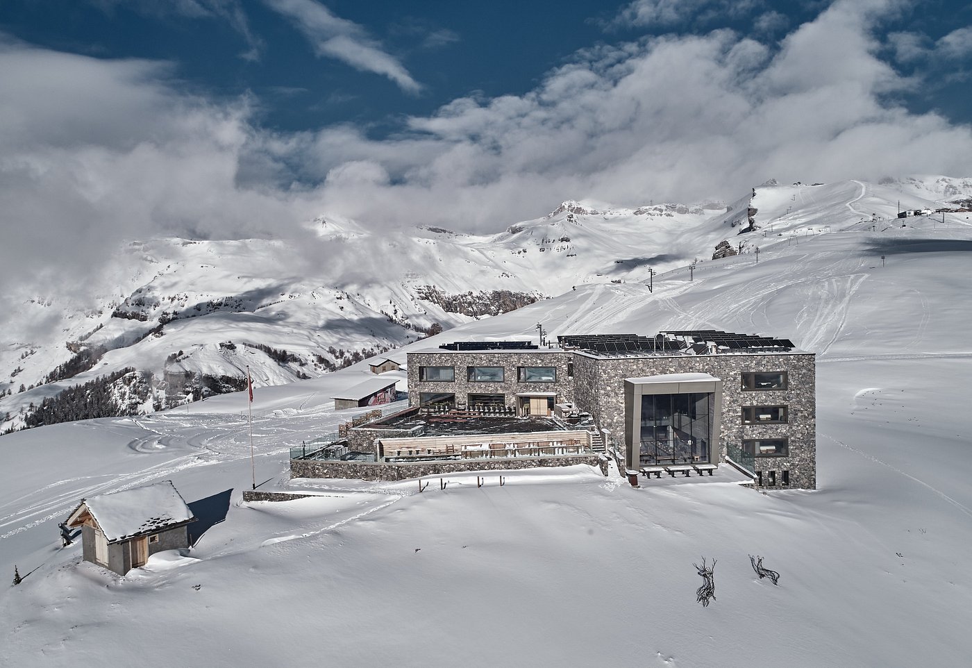 The Chetzeron Hotel is an architectural masterpiece at 2112 meters above sea level, high above the Rhone Valley with a magnificent view from the Matterhorn to Mont Blanc. The former mountain station has been converted into a boutique hotel with the Minergie-Eco standard, with 16 junior suites and rooms in an urban-alpine style, a spa area, meditation room, lobby with fireplace, bar and 3 restaurants, and of course a ski-in and ski-out experience in winter.